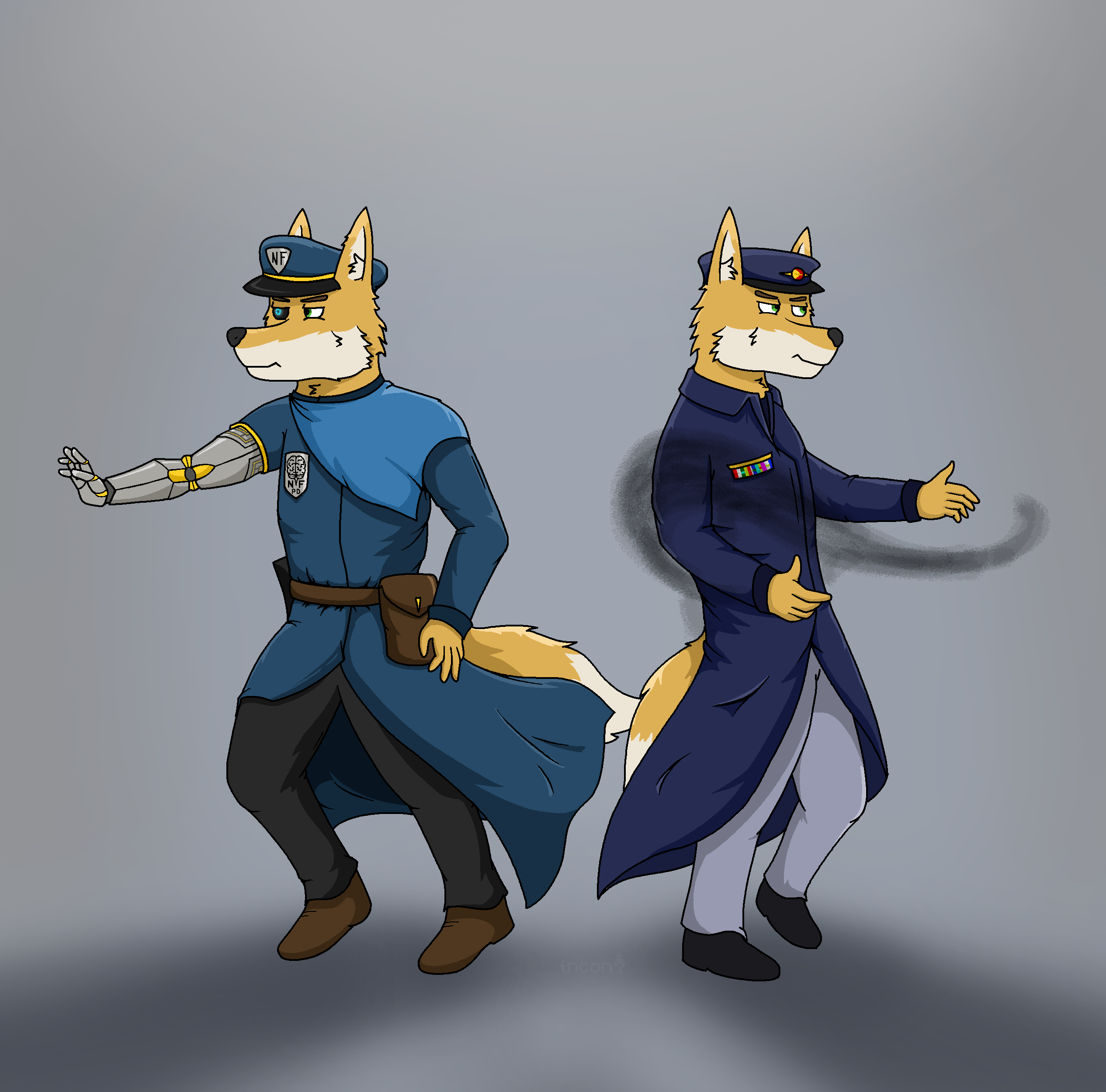 Louis stands at 5'9“ and boasts a cybernetic right arm and a cybernetic right eye. While his former self wore a green longcoat, he much rather prefers the blue uniform of station security. He often wears a cap to cover his otherwise exposed brain.